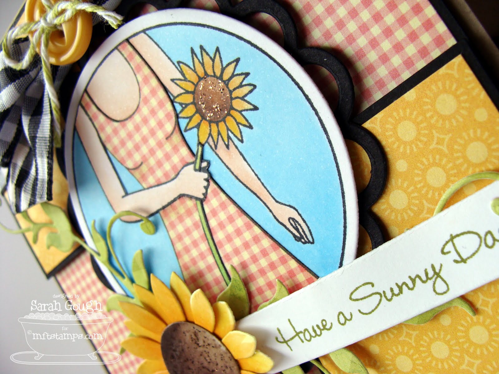 I created my sunflower embellishment using the Upsy Daisy die-namics, cutting it from X-press It blending cardstock and colouring the petals with Copics. Sunflowers have larger centers than daisies, so I punched a circle, coloured it and added a little cinnamon stickles for sparkle and texture. That awesome black ribbon is available from MFT too.
